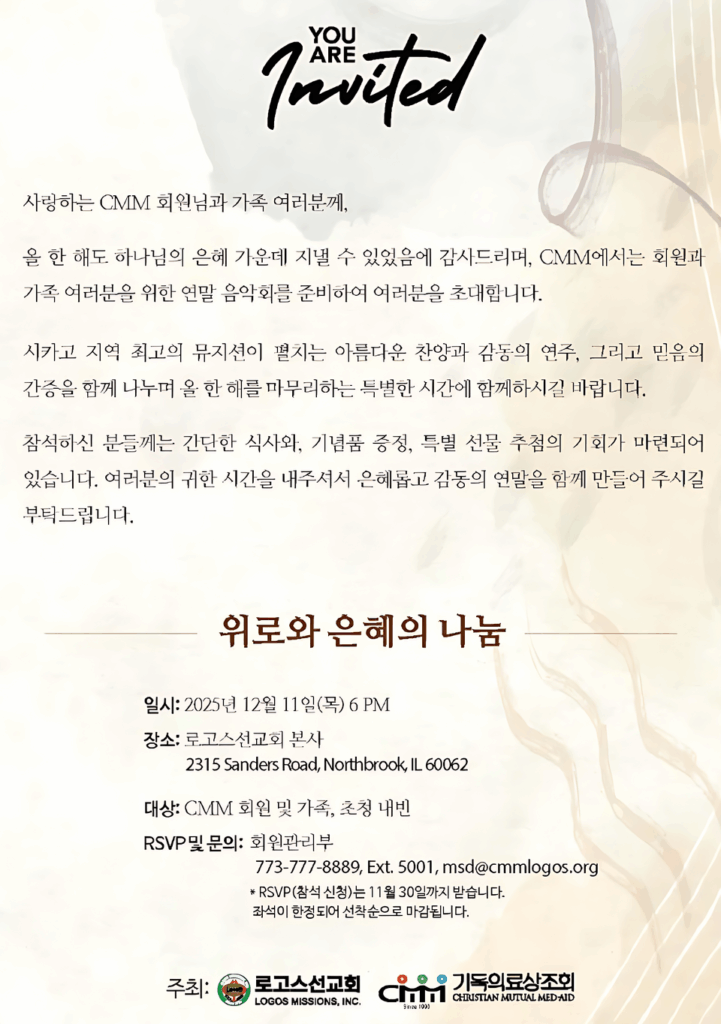 로고스선교회와 CMM 기독의료상조회(이하 CMM)가 회원 및 가족 초청으로 특별한 연말 행사를 마련하였습니다. 오는 12월 11일(목) 오후 6시, 노스브룩 소재 로고스선교회 본사(2315 Sanders Road) 에서 ‘위로와 은혜의 나눔’을 주제로 CMM 회원 초청 연말 음악회를 개최합니다.